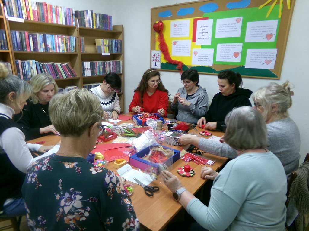 Walentynki – coroczne święto zakochanych, przypadające 14 lutego, było inspiracją do przeprowadzenia przez Filię Biblioteczną w Przygłowie warsztatów plastyczno-technicznych pt. „Ten dzień jest wyjątkowy, bo walentynkowy”. Czytelniczki placówki wykonały podczas spotkania karty walentynkowe i okazjonalne stroiki wg własnego pomysłu. Inwencja twórcza, pomysłowość, wyobraźnia i zdolności artystyczne pań pozwoliły stworzyć różnorodne i ciekawe prace. Rękodzieło to oryginalny i niepowtarzalny prezent! Spotkanie upłynęło w miłej atmosferze dopełnionej słodkim akcentem walentynkowym.