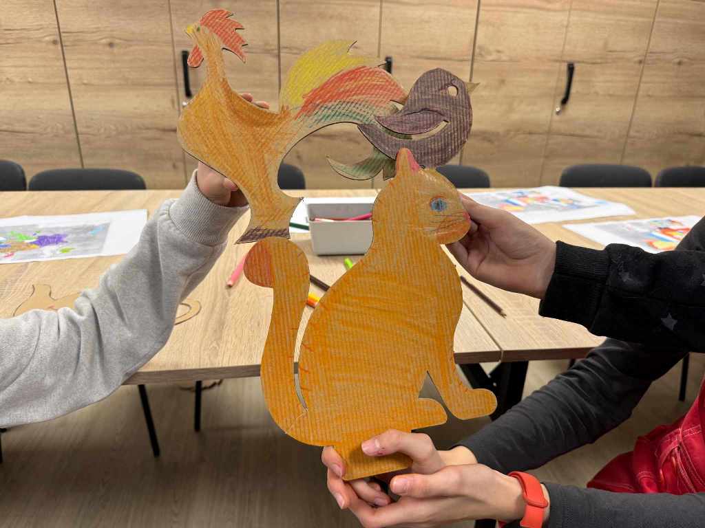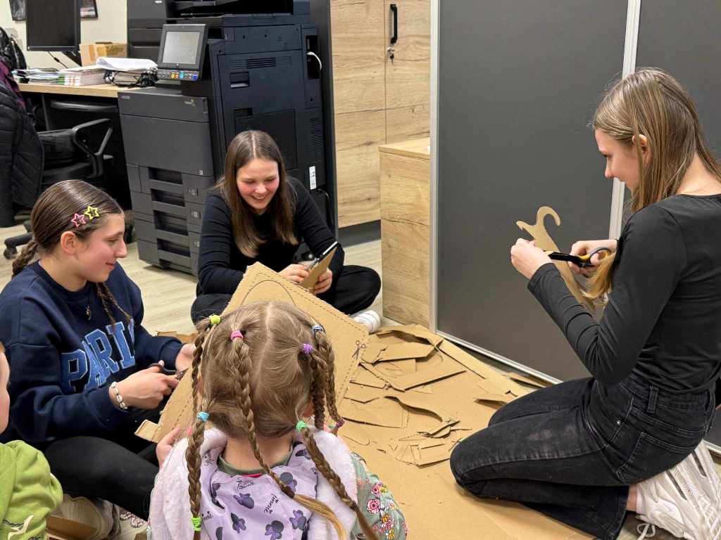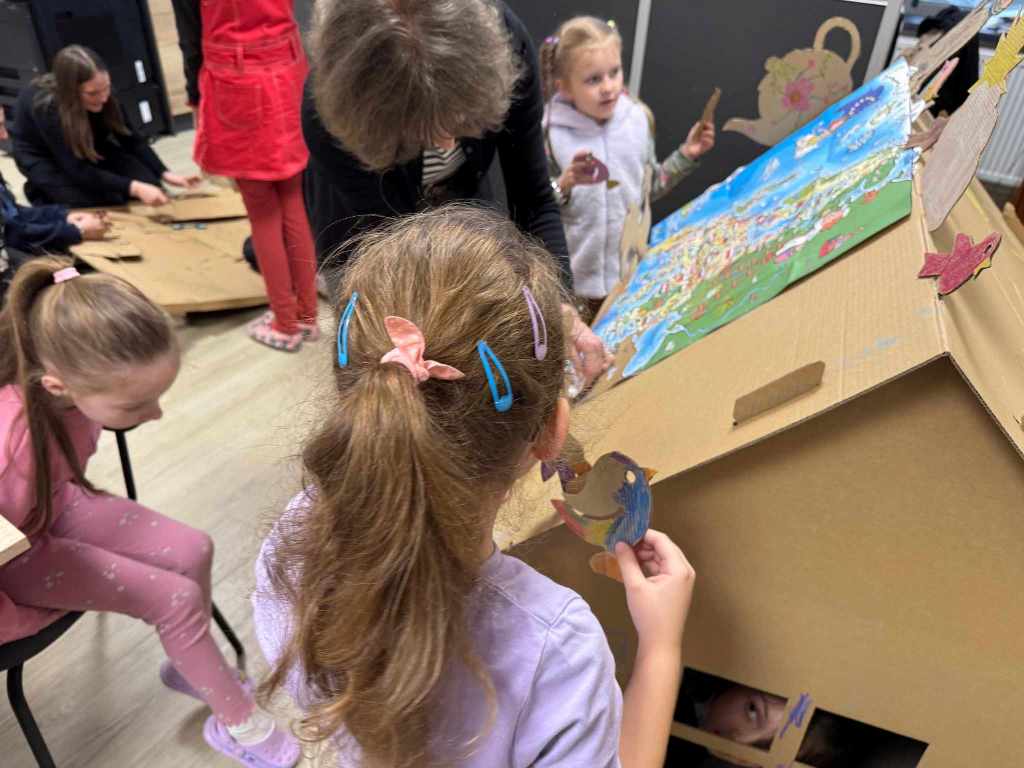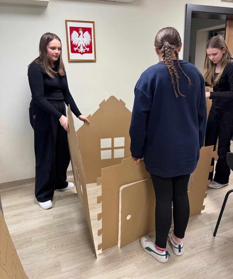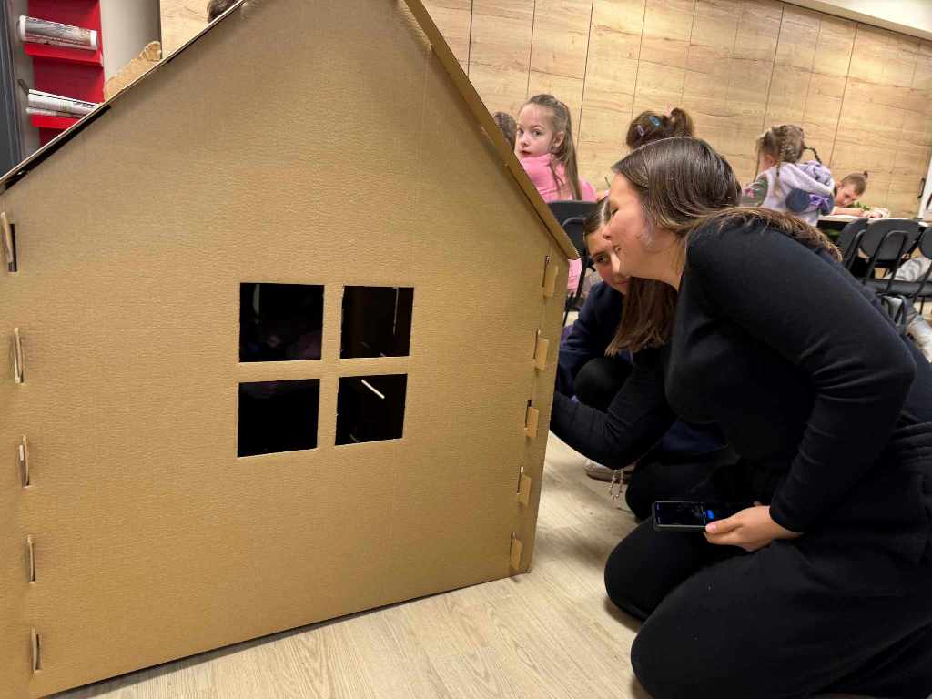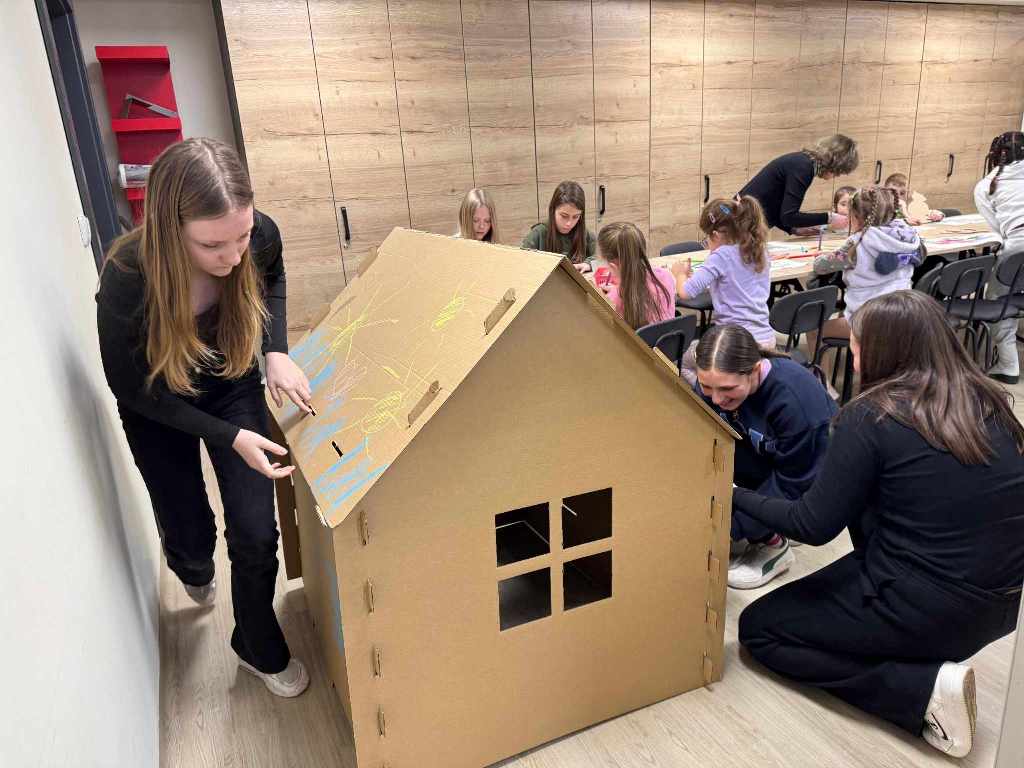 Uczestnicy poznali ciekawostki o różnych państwach, ich kulturze i tradycjach Jedną z głównych atrakcji było budowanie domku z tektury – dzieci wspólnie tworzyły i dekorowały konstrukcję, inspirowaną europejską architekturą! Praca zespołowa sprawiła im mnóstwo radości, a efekt końcowy zachwycił wszystkich!