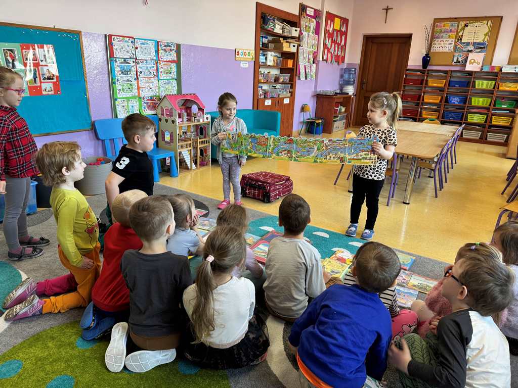 Podczas spotkania bibliotekarz zaprezentował kolorowe i interesujące książki, które rozbudziły wyobraźnię maluchów i zachęciły je do samodzielnego odkrywania nowych historii. Dzieci dowiedziały się również, że w książkach mogą kryć się różne historie, także te o wiośnie. Przedszkolaki wzięły udział w wiosennych zabawach oraz odgadywały jakie owady ukryły się w słoikach. Nie zabrakło także wspólnego czytania, tym razem wybór padł na wiersze Małgorzaty Strzałkowskiej oraz Haliny Szayerowej.