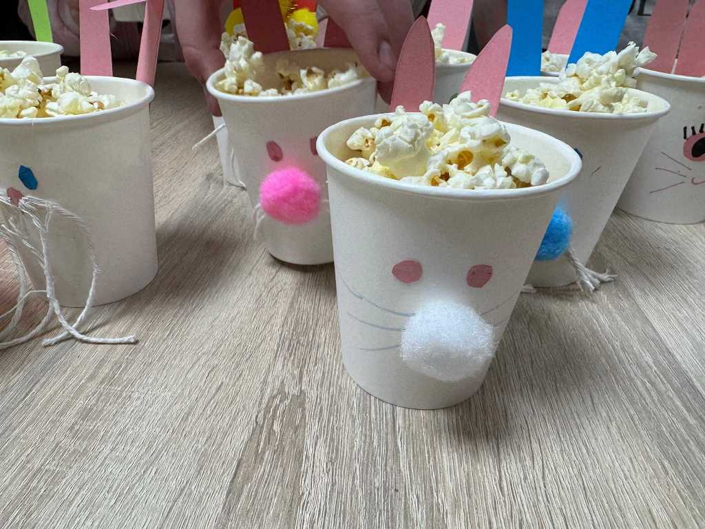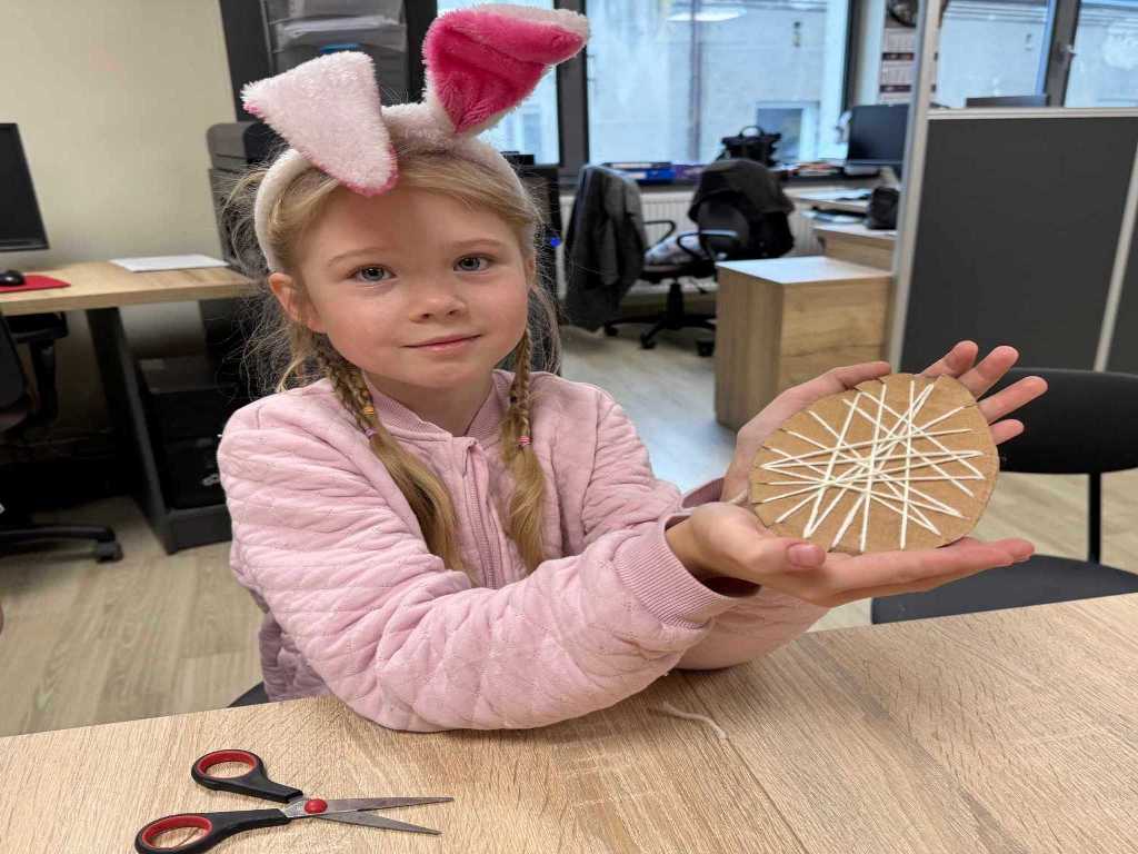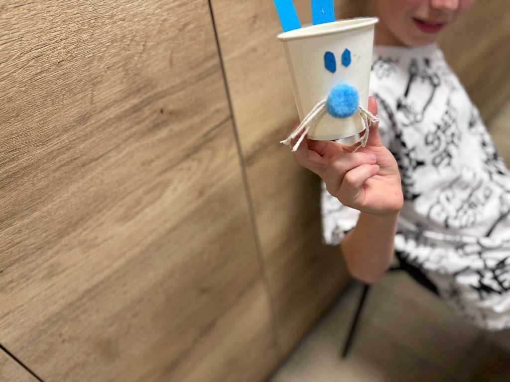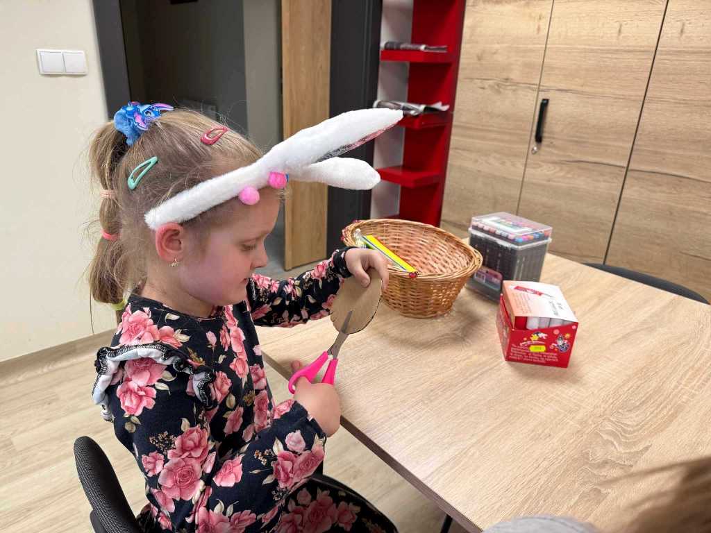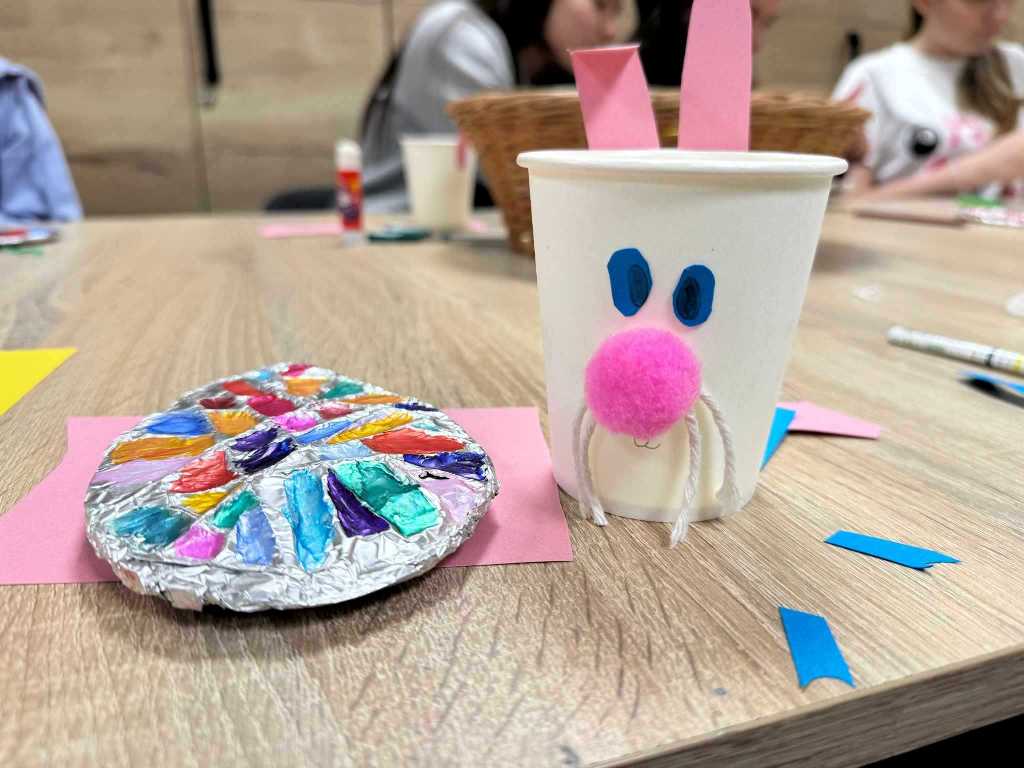 W części plastycznej dzieci wykonały pisanki z tektury, które ozdabiały według własnych pomysłów, a także zajączki z kubeczków papierowych – stanowiące same w sobie oryginalne, świąteczne dekoracje, a u nas brzuszki zajączków na koniec zajęć zostały wypełnione drobną niespodzianką.