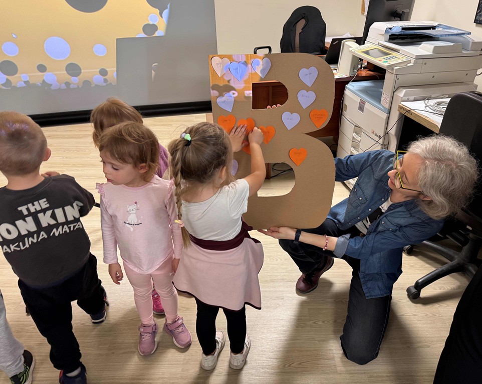 Spotkanie odbyło się w przyjaznej atmosferze – na miękkim dywanie, w otoczeniu książek i dziecięcego śmiechu. Dzieci wspólnie poznały literkę „B” jak Biblioteka, wysłuchały pięknej historii autorstwa Ingi Moore oraz wzięły udział w bajkowych zabawach ruchowych, które wprowadziły je w magiczny świat wyobraźni.