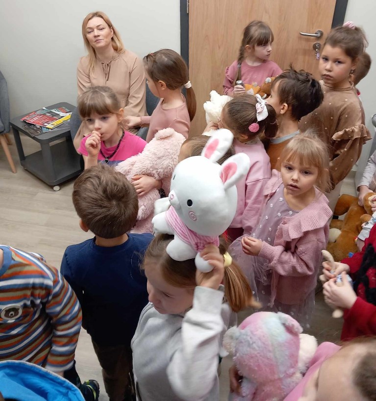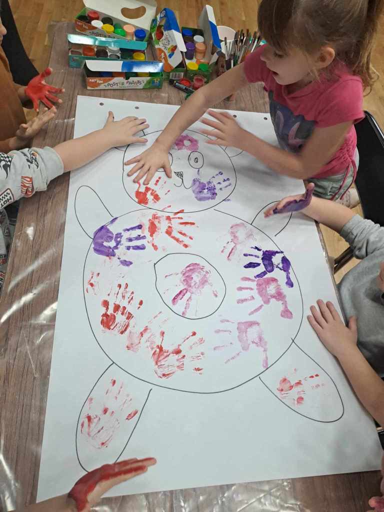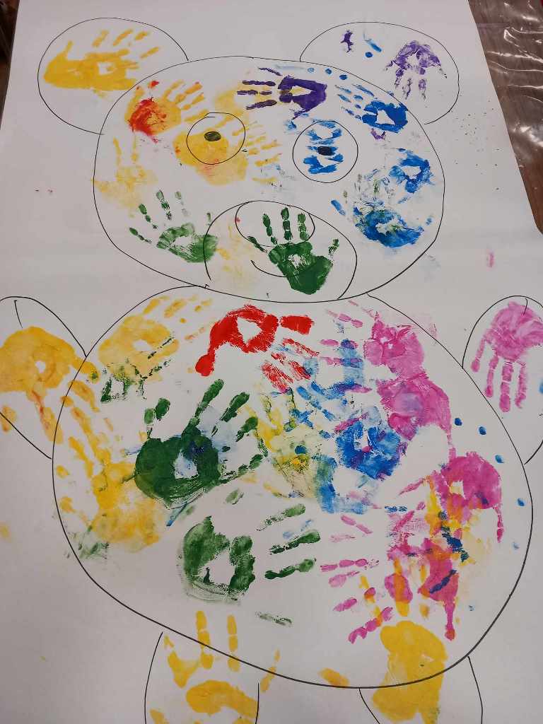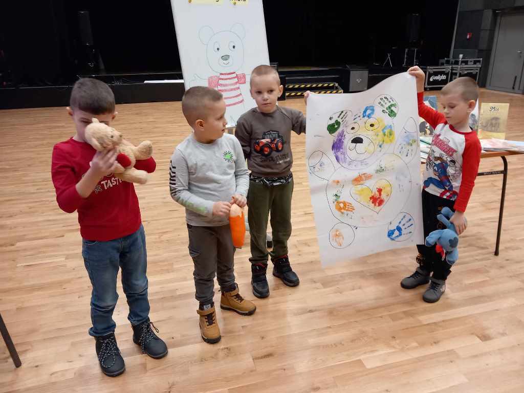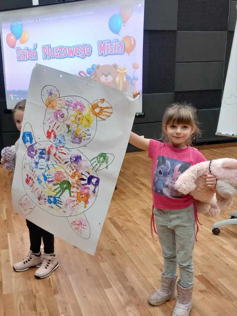 Spotkanie rozpoczęła rozmowa o pluszowych misiach – tych z bajek i tych, które dzieci przytulają na co dzień. Następnie przedszkolaki przystąpiły do twórczego zadania: na dużych arkuszach papieru, za pomocą
